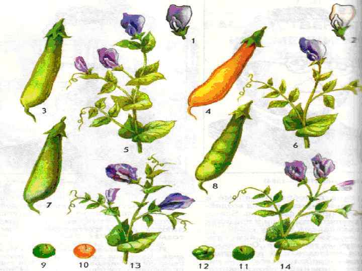 Альтернативные признаки гороха, заинтересовавшие Г. Менделя: Признаки • Окраска венчика • Окраска бобов • Рост • Окраска семени • Поверхность семени • Форма бобов • Расположение цветков доминантный рецессивный красная зелёная высокий жёлтая гладкая простая пазушное белая жёлтая низкий зелёная морщинистая членистая верхушечное
