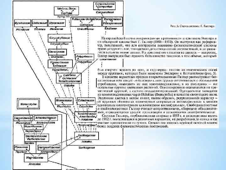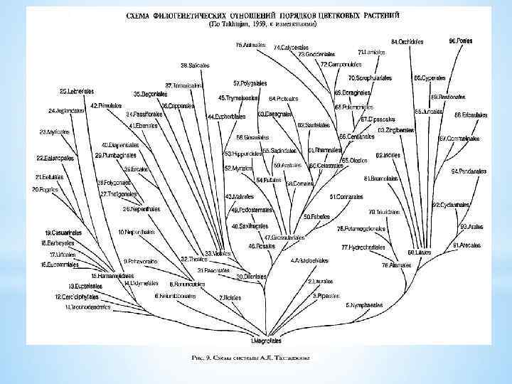 *Система А. Л. Тахтаджяна построена по привычному типу «филогенетиче ского древа» , в котором линии, связующие таксоны, рассматриваются как линии генеалогической преемственности, хотя, конечно, ясно, что речь идет не о выведении современных таксонов из современных же; предполагается, что современные систематические группы берут начало от каких-то неизвест ных нам предковых форм. *Многие систематики склонны считать, что отношения между таксонами при современном уровне наших знаний нельзя выразить в форме «древа» , поскольку мы имеем дело не с самим филогенезом, а только с его результатами. Поэтому, пра вильнее представлять себе графическое изображение системы в виде среза кроны филогенетического древа или проекции ее на плоскость.