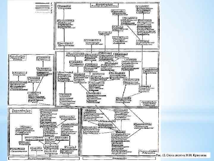 *Такого рода схемы, более объективные, и предложены, Стеббинсом и Дальгреном. На них взаимное расположение таксонов показывает только эволюционную удален ность от предполагаемого общего предка и степень сходства их между собой. *Следует упомянуть, что некоторые исследователи придержива ются мнения о полифилетическом происхождении покрытосеменных. В нашей стране наиболее изве стнаполифилетическая система Н. И. Кузнецова (1914). Никола й Ива нович Кузнецо в (1864 — 1932)