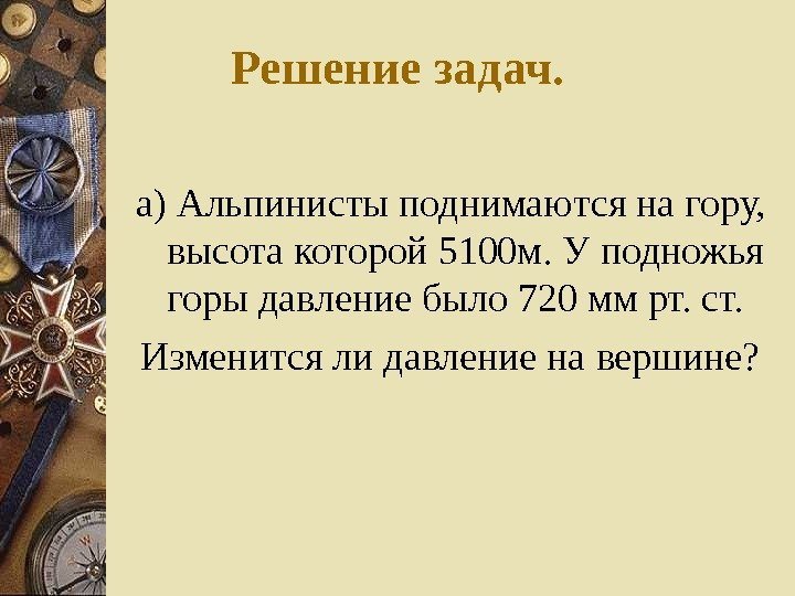 Решение задач. а) Альпинисты поднимаются на гору, высота которой 5100 м. У подножья горы давление было 720 мм рт. ст. Изменится ли давление на вершине?