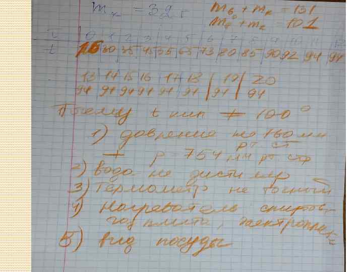 После того, как мы довели воду до кипения, мы составили таблицу Врем 0 1 я t 16 30 2 3 4 5 6 7 8 35 45 55 65 73 80 85 Время 9 10 11 12 13 14 15 16 17 94 94 t 90 92 Врем я 18 19 20