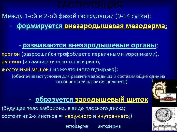 ГАСТРУЛЯЦИЯ Между 1 -ой и 2 -ой фазой гаструляции (9 -14 сутки): - формируется внезародышевая мезодерма; - развиваются внезародышевые органы: хорион (разросшийся трофобласт с первичными ворсинками), амнион (из амниотического пузырька), желточный мешок ( из желточного пузырька); (обеспечивают условия для развития зародыша и составляющие одну из особенностей развития человека) - образуется зародышевый щиток (будущее тело эмбриона, в виде плоского диска; состоит из 2 -х листков = наружного и внутреннего; ) эктодерма энтодерма