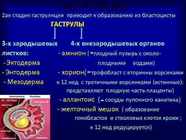 ГАСТРУЛЯЦИЯ 2 ая стадия гаструляции приводит к образованию из бластоцисты ГАСТРУЛЫ 3 -х зародышевых 4 -х внезародышевых органов листков: - амнион ( плодный пузырь с около - Эктодерма плодными водами) - Энтодерма - хорион( трофобласт с вторичны ворсинами - Мезодерма к 12 нед с третичными ворсинками (истинные): представляют плодную часть плаценты) - аллантоис ( сосуды пупочного канатика) - желточный мешок ( образование гонобластов и стволовых клеток крови ; к 12 нед редуцируется)