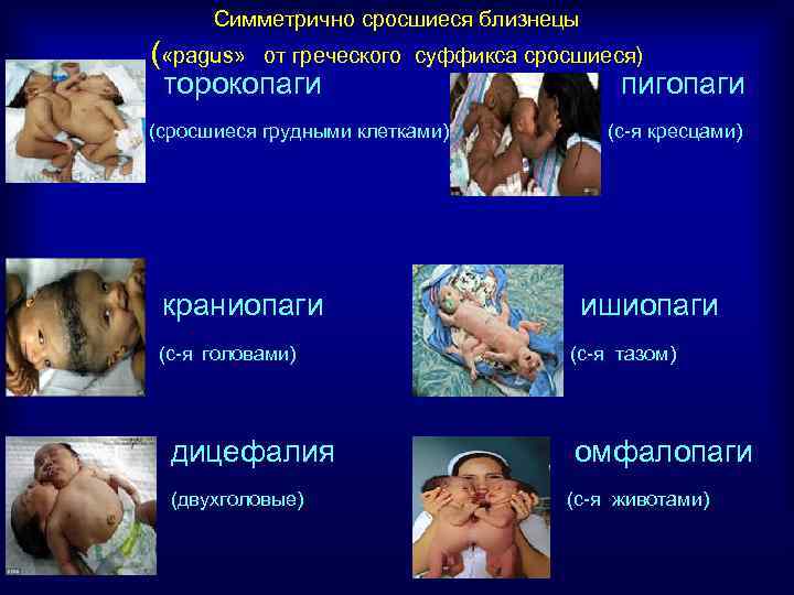 Симметрично сросшиеся близнецы • ( «pagus» от греческого торокопаги • (сросшиеся грудными клетками) краниопаги (с-я головами) дицефалия (двухголовые) суффикса сросшиеся) пигопаги (с-я кресцами) ишиопаги (с-я тазом) омфалопаги (с-я животами)