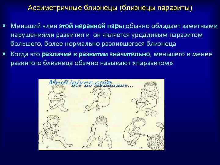 Ассиметричные близнецы (близнецы паразиты) • Меньший член этой неравной пары обычно обладает заметными нарушениями развития и он является уродливым паразитом большего, более нормально развившегося близнеца • Когда это различие в развитии значительно, меньшего и менее развитого близнеца обычно называют «паразитом»