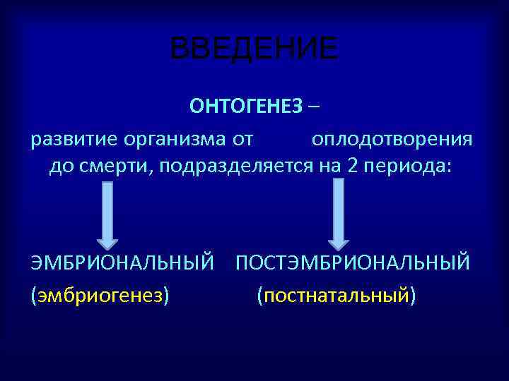 ВВЕДЕНИЕ ОНТОГЕНЕЗ – развитие организма от оплодотворения до смерти, подразделяется на 2 периода: ЭМБРИОНАЛЬНЫЙ ПОСТЭМБРИОНАЛЬНЫЙ (эмбриогенез) (постнатальный)