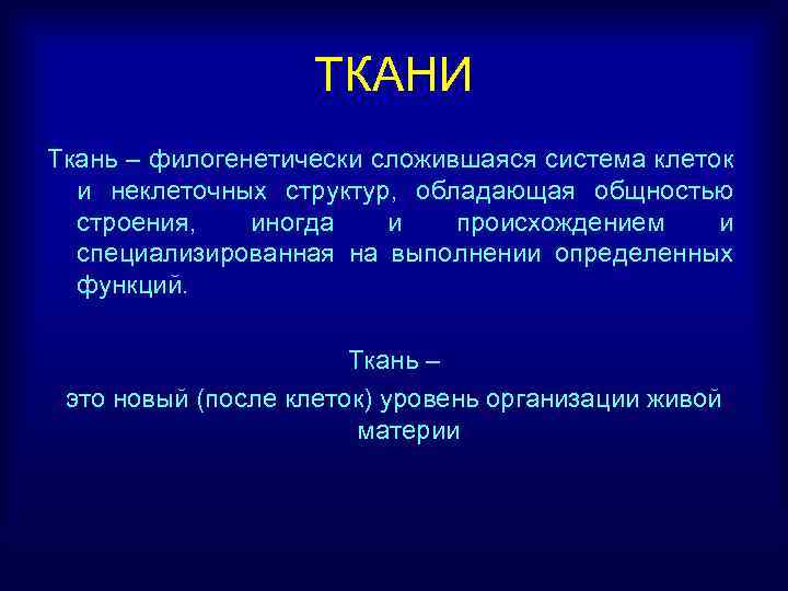 ТКАНИ Ткань – филогенетически сложившаяся система клеток и неклеточных структур, обладающая общностью строения, иногда и происхождением и специализированная на выполнении определенных функций. Ткань – это новый (после клеток) уровень организации живой материи