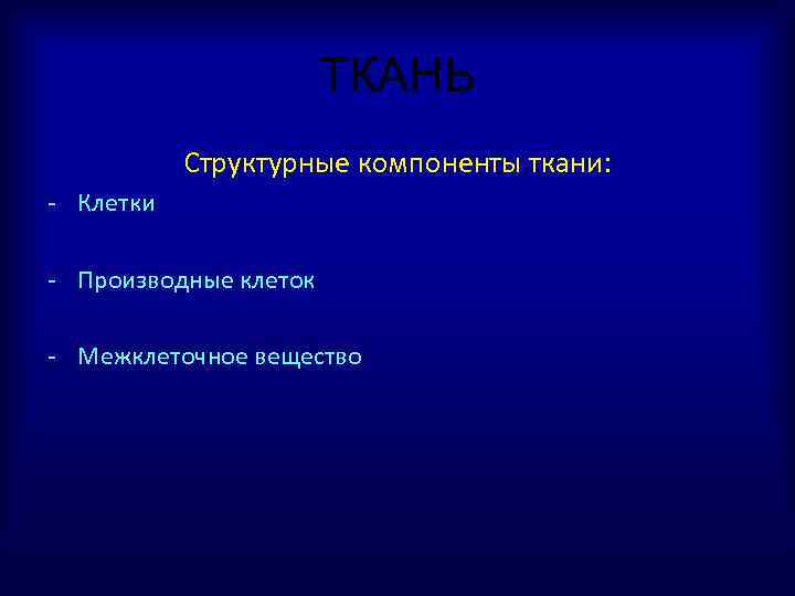 ТКАНЬ Структурные компоненты ткани: - Клетки - Производные клеток - Межклеточное вещество