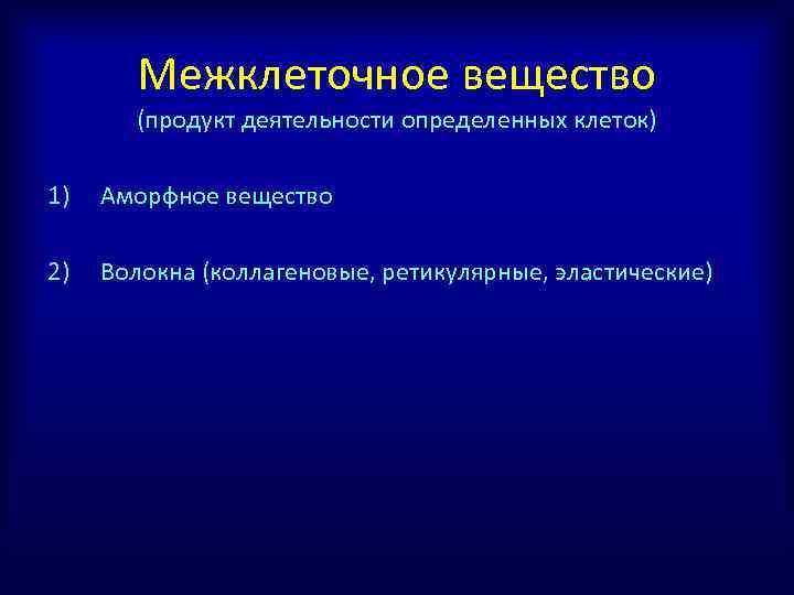 Межклеточное вещество (продукт деятельности определенных клеток) 1) Аморфное вещество 2) Волокна (коллагеновые, ретикулярные, эластические)