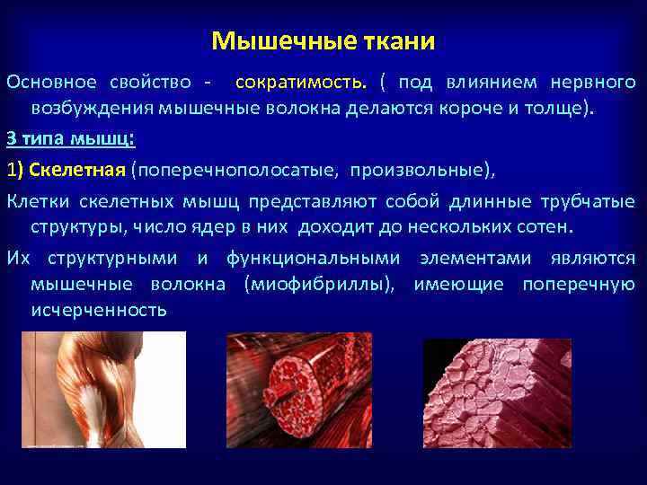 Мышечные ткани Основное свойство - сократимость. ( под влиянием нервного возбуждения мышечные волокна делаются короче и толще). 3 типа мышц: 1) Скелетная (поперечнополосатые, произвольные), Клетки скелетных мышц представляют собой длинные трубчатые структуры, число ядер в них доходит до нескольких сотен. Их структурными и функциональными элементами являются мышечные волокна (миофибриллы), имеющие поперечную исчерченность