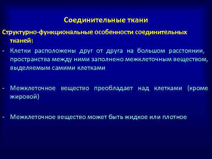 Соединительные ткани Структурно-функциональные особенности соединительных тканей: - Клетки расположены друг от друга на большом расстоянии, пространства между ними заполнено межклеточным веществом, выделяемым самими клетками - Межклеточное вещество преобладает над клетками (кроме жировой) - Межклеточное вещество может быть жидкое или плотное