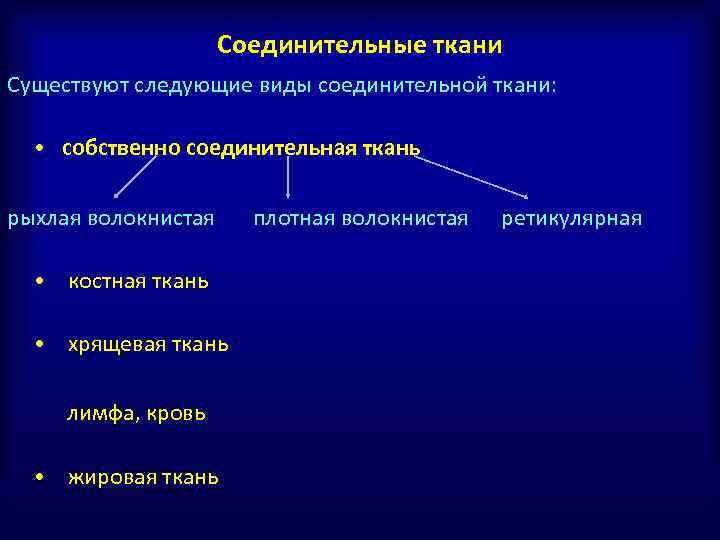 Соединительные ткани Существуют следующие виды соединительной ткани: • собственно соединительная ткань рыхлая волокнистая плотная волокнистая ретикулярная • костная ткань • хрящевая ткань лимфа, кровь • жировая ткань