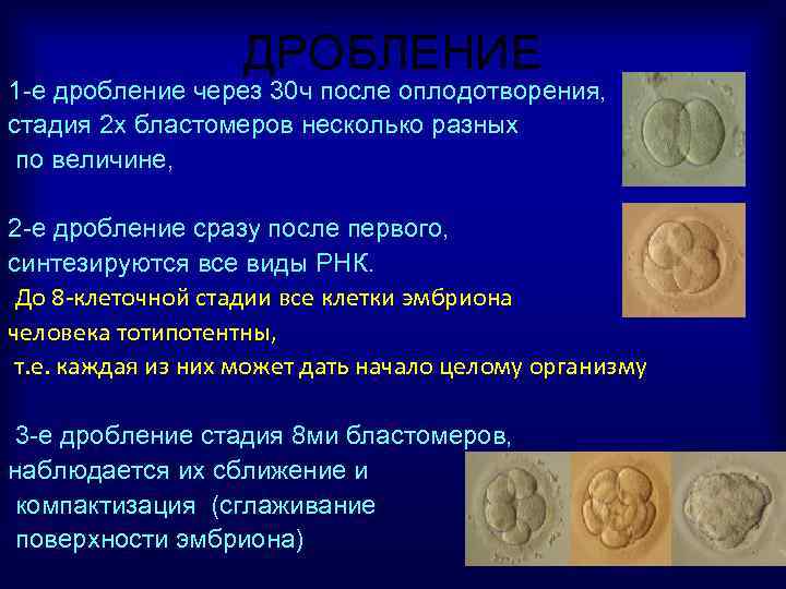 ДРОБЛЕНИЕ 1 -е дробление через 30 ч после оплодотворения, стадия 2 х бластомеров несколько разных по величине, 2 -е дробление сразу после первого, синтезируются все виды РНК. До 8 -клеточной стадии все клетки эмбриона человека тотипотентны, т. е. каждая из них может дать начало целому организму 3 -е дробление стадия 8 ми бластомеров, наблюдается их сближение и компактизация (сглаживание поверхности эмбриона)