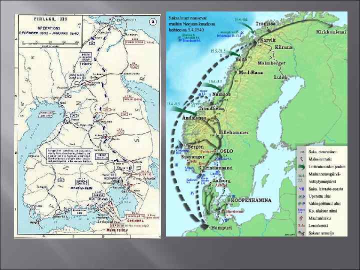 Финская война 39 -40 гг. 5 октября 1939 г. советское руководство предложило заключить такой же пакт о взаимной помощи правительству Финляндии, однако оно отклонило предложение, ссылаясь на свой нейтралитет. 30 ноября 1939 г. Кр. Армия развернула наступление в глубь финской территории. «зимняя война» с Финляндией закончилась подписанием 12 марта 1940 г. мира на советских условиях. Условно войну с Ф. можно разделить на два периода – с 30 ноября 1939 г. до 10 февраля 1940 г. –попытки прорыва «Линии Маннергейма» и с 11 февраля до 12 марта 1940 г. – выход К. А. на оперативный простор и сдача финнов. Потери: финов 26660 красноармейцев – от 95000 до 150 000 Условия мирного договора были ужесточены: Карельский перешеек с г. Выборг, район Куолаярви, ряд островов в Финском заливе, а также части полуостровов Рыбачьего и Среднего. Ф. сдала в аренду на 30 лет полуостров Ханко
