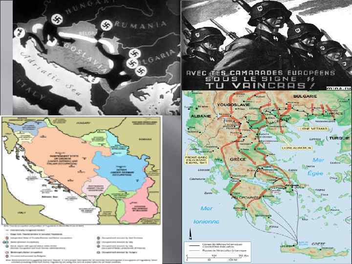 В апреле 1941 г. германские войска провели Балканскую компанию целью которой был разгром греческой и югославской армий и включение Греции и Югославии в сферу германского господства. Итальянская армия ещё в конце 1940 г. безуспешно пыталась разбить греческие войска, проведя операцию «Марита» . По мнению германских нацистов, Югославия была таким же искусственным образованием как и Чехословакия. Ещё в 1932 г. Гитлер говорил о необходимости расчленения Югославии. Ликвидация этого государства считалась в фашистских кругах неотъемлемой частью восточной политики Германии. В конце 30 -х гг. югославское правительство попыталось достичь компромисса с фашистской Германией и Италией, которые, в свою очередь, временно готовы были пойти на компромисс. Германия рассчитывала подчинить себе Балканский полуостров с помощью коллаборационистских правительств. Только в марте 1941 г. , когда в Белграде было свергнуто профашистское правительство Цветковича и Югославия отказалась утвердить акт о присоединении к Берлинскому пакту, Гитлер увидел, что с помощью коллаборационистов не удасться включить Югославию в сферу германского господства. Было принято решение о военном решении вопроса. Наступление на Югославию с 6 апреля 1941 г. одновременно вели с территорий Болгарии, Венгрии и Австрии более 80 немецких, итальянских и венгерских дивизий. Им противостояли 40 неполных дивизий югославской армии. Оборона югославских войск была без труда прорвана и 12 апреля германские войска и их союзники вошли в Белград. Уже 17 апреля Югославия капитулировала.