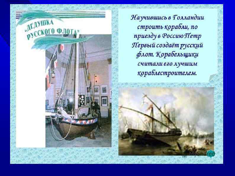 Пётр живо интересовался всем, что было связано с военным делом, кораблестроением, техническими новинками. В Голландии царь лично изучал искусство кораблестроения и прошёл курс обучения в качестве корабельного плотника.