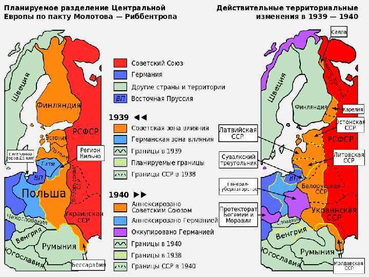 СССР В НАЧАЛЕ ВТОРОЙ МИРОВОЙ ВОЙНЫ В августе 1940 г. ЛИТВА, ЛАТВИЯ, ЭСТОНИЯ официально вступили в СССР в качестве союзных республик. На территории перешедших от РУМЫНИИ к СССР БЕССАРАБИИ и СЕВЕРНОЙ БУКОВИНЫ - образована МОЛДАВСКАЯ СССР. ЭСТОНИЯ – до 1917 г. в составе России. 1918 -1939 гг. – независимое государство ЛАТВИЯ – входила в состав России до 1914 г. 1920 -1939 гг. – независимое государство ЛИТВА – входила в состав России до 1914 г. 1919 -1939 гг. – независимое государство ВОСТОЧНАЯ ГАЛИЧИНА и ЗАПАДНОЕ ПОДОЛЬЕ до 1918 г. входили в состав Австро. Венгрии. Отошли к Польше по условиям Рижского мира 1921 г. Западноукраинские (Волынь) и Западнобелорусские земли отошли к Польше после Рижского мира 1921 г. СЕВЕРНАЯ БУКОВИНА до 1918 г. – в составе Австро-Венгрии. Аннексирована Румынией в 1918 г. БЕССАРАБИЯ до 1918 г. в составе России. Аннексирован а Румынией в 1918 г.