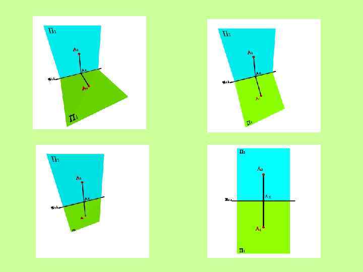 • • При построении проекции необходимо помнить, что ортогональной проекцией точки на плоскость является основание перпендикуляра, опущенного из данной точки на эту плоскость. Точка А и ее ортогональные проекции А 1 и А 2, которые называют соответственно горизонтальной и фронтальной проекциями. Проекции точки всегда расположены на прямой, перпендикулярной оси Х 2 и пересекающей эту ось в точке А х.