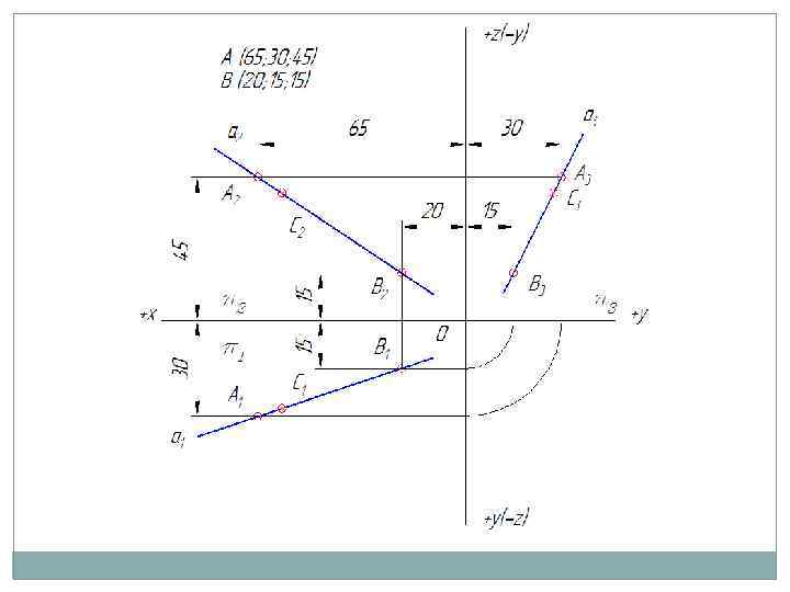 2. 3. Деление отрезка в заданном отношении Чтобы разделить отрезок, заданный двумя проекциями, в некотором отношении (например, разделить отрезок АВ точкой С в отношении АС : СВ= 2: 3 ), необходимо: 1. Построить вспомогательную произвольную прямую (а 0 ) к любой проекции отрезка; 2. Отложить на вспомогательной прямой равные между собой отрезки произвольной длины. Количество отрезков соответствует длине всего отрезка в частях (в нашем случае – 5 равных отрезков); 3. Затем последнюю точку (В 0) на вспомогательной прямой соединить со второй проекцией заданного отрезка; 4. Найти на вспомогательной прямой (а 0 ) точку, отстоящую от начала отрезка (А 2) на расстоянии 2 -х частей (С 0 ), и провести через неё прямую, параллельную (В 0 В 2 ) до пересечения с проекцией отрезка (А 2 В 2 ); 5. Полученная точка (С 2 ), будет являться одной из проекций искомой точки. Недостающую проекцию (С 1 ), найти посредством линии проекционной связи. Если точка делит отрезок в заданном отношении, то проекции этой точки делят проекции отрезка в том же отношении.