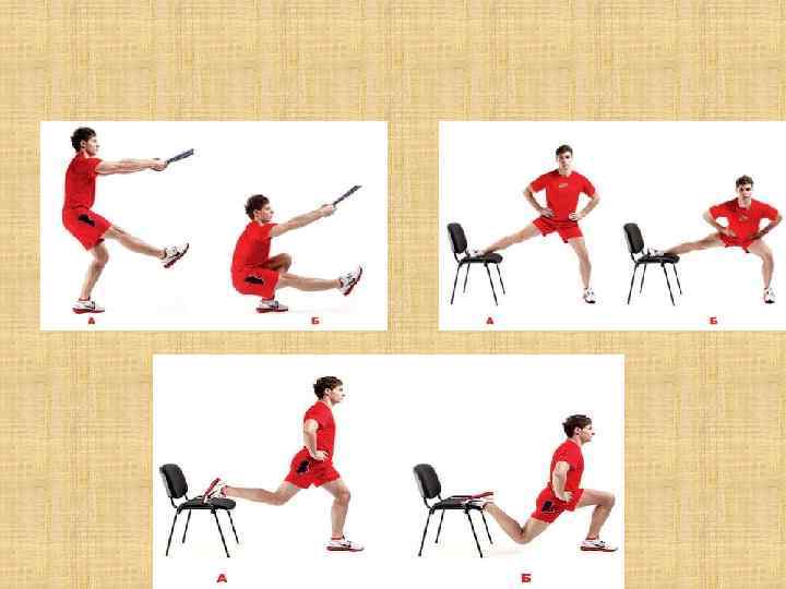• КАЧАЙ НОГИ БЕЗ ШТАНГИ Приседания на одной ноге: Поясница Несмотря на то что у тебя на спине не лежит штанга, поясница все равно должна быть прямой. Если ты ее округлишь, это, разумеется, не скажется на ее здоровье, но может испортить тебе технику других похожих упражнений, которые ты делаешь (или когда-нибудь будешь делать) с дополнительным весом. Таз Начинай движение с отведения таза назад, будто садишься на унитаз (сравнение грубое, но точное). Колено при этом можно немного увести вперед, главное, чтобы пятка опорной ноги не отрывалась от поверхности стула. Стопа Ставь опорную ногу (ту, на которой будешь приседать) почти на самый край стула. Так твоя свободная нога не будет мешать движению, упираясь в пол или поверхность стула. Кстати, приседать, стоя на стуле, нужно именно поэтому - так удобнее. Голова Не опускай взгляд - иначе твоя голова тоже наклонится вперед, а вслед за ней и корпус, в результате чего ты потеряешь равновесие. Колено опорной ноги всегда должно быть подпружиненным. Никогда не выпрямляй эту ногу полностью, если не хочешь заработать травму сустава. Руки Для лучшего сохранения равновесия (все-таки ты стоишь на одной ноге) поднимай прямые руки перед собой примерно до уровня груди, когда опускаешься. Для пущего удобства и утяжеления приседа в руки можно взять пару легких гантелей. ВАРИАЦИИ НА ТЕМУ Три шага к приседу Если приседать на одной ноге у тебя пока не получается, начни с этих, более простых упражнений, которые задействуют все мышцы ног. 1)БОЛГАРСКИЙ СПЛИТ-ПРИСЕД МЫШЦЫ: акцент на разгибателях бедра. ВЫПОЛНЕНИЕ: встань спиной к стулу на расстоянии одного большого шага. Подъем правой ноги положи на сиденье, руки поставь на пояс (А). Глубоко присядь на левой ноге (Б), вернись в положение А и повтори. КЛЮЧЕВОЕ ОТЛИЧИЕ: несмотря на то что здесь ты вроде бы тоже приседаешь на одной ноге, вторая нога серьезно помогает сохранять равновесие. 2)БОКОВОЙ ВЫПАД С ОПОРОЙ НА СТУЛ МЫШЦЫ: акцент на приводящие бедра. ВЫПОЛНЕНИЕ: встань боком к стулу на расстоянии одного большого шага. Стопу правой ноги положи на сиденье, чуть согни левую ногу в колене и выпрямись (А). Отводя таз назад, присядь как можно глубже, стараясь не сгибать правую ногу (Б). Вернись в положение А и повтори. КЛЮЧЕВОЕ ОТЛИЧИЕ: в этом варианте значительно сложнее сохранять равновесие, чем в болгарском приседе, плюс дополнительно тренируется гибкость. 3)ПРИСЕД НА ОДНОЙ НОГЕ С ПОЛОТЕНЦЕМ МЫШЦЫ: акцент на квадрицепсах. ВЫПОЛНЕНИЕ: закрепи полотенце на уровне груди, возьми свободный конец обеими руками и отойди назад так, чтобы полотенце натянулось, а руки полностью выпрямились (А). Сохраняя равновесие за счет натяжения полотенца, опустись в глубокий присед на одной ноге (Б). Вернись в положение А и повтори. КЛЮЧЕВОЕ ОТЛИЧИЕ: помощи в сохранении баланса почти нет, особенно в самой нижней точке, так что фактически ты почти уже приседаешь на одной ноге.