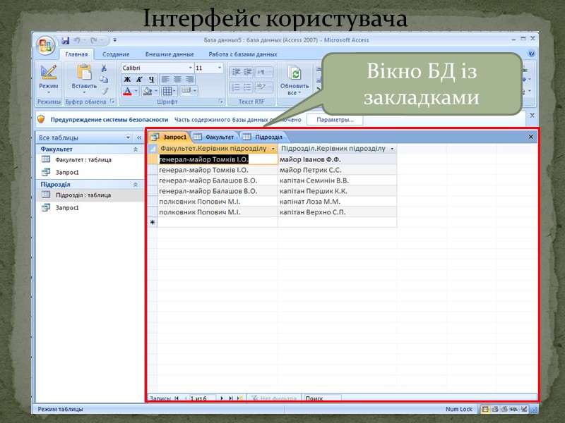 Інтерфейс користувача СУБД MS Access. 2 Національна академія Державної прикордонної служби України Кафедра зв’язку, автоматизації та захисту інформації