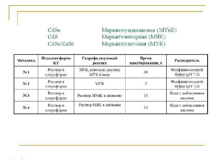Біологічні системи, що дозволяють отримувати КТ Бактерії та дріжджі Локалізація Clostridium thermoaceticum Cd. S Позаклітинна Candida glabrata Cd. S Внутрішньоклітинна Schizosaccharomyces Cd. S pombe Внутрішньоклітинна Escherichia coli Rhodopseudomonas palustris Rhodobacter sphaeroides Pseudomonas aeruginosa Cd. S; Cd. Te Внутрішньоклітинна Cd. S Внутрішньоклітинна Zn. S Позаклітинна Zn. S; Pb. S Внутрішньоклітинна Мікроводорості та гриби Phaeodactylum Cd. S tricornutum Cd. S; Fusarium Cd. Se oxysporum Локаліза ція Внутрішньо клітинна Позаклітин на