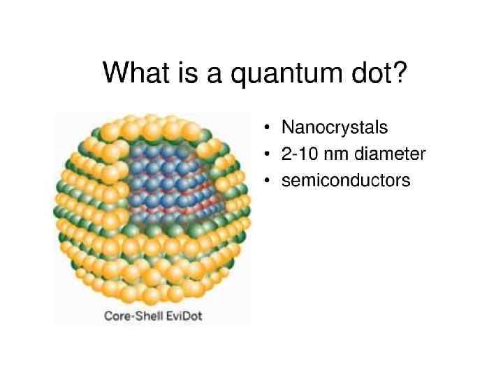 Структура квантових точок Квантова точка (КТ) – ділянка напівпровідника, в якій рух електронів просторово обмежений в трьох напрямках. Напівпровідникове ядро квантової точки утворене елементами II-VI або III-V груп періодичної системи, оточене оболонкою, яка складається з інших напівпровідникових матеріалів. Зазвичай квантова точка містить від 200 до 10 000 атомів та має діаметр в межах 2 -10 нм. До типових напівпровідникових нанокристалів відносять Zn. S, Cd. Se, Cd. Te та In. P, In. As. покриття з амфіфільних полімерів оболонка ядро