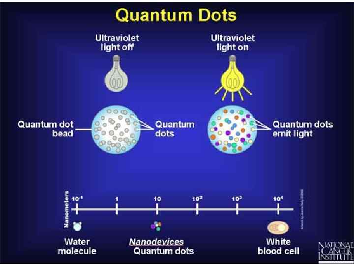 Основні оптичні властивості квантових точок 1. Широкі спектри поглинання 2. Випромінювання у вузькому діапазоні довжин хвиль 3. Високий рівень яскравості флуоресценції 4. Висока фотостабільність 5. Високий квантовий вихід люмінісценції Колір флуоресценції нанокристалу залежить від: - хімічного складу - особливостей поверхні - розміру, а саме, відносно великі квантові точки мають червоний спектр флуоресценції. У той же час, для менших нанокристалів спостерігається зелена та синя флуоресценція.