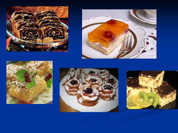 Десерти Поляки закінчують обід десертом, а так як вони відомі ласуни, то тістечка і торти є невід'ємною частиною їх кулінарної культури. Тістечка найчастіше роблять із дріжджового тіста. Sernik - пиріг на базі сиру. Makowiec - пиріг фарширований Відомими десертами Польщі є такі : Galaretka - фруктове желе, подається перемеленим маком. Szarlotka - яблучний пиріг, іноді подається зі збитими вершками або морозивом. зі збитими вершками або з фруктами. Faworki - тонкі і крихкі тістечка посипані цукровою пудрою.