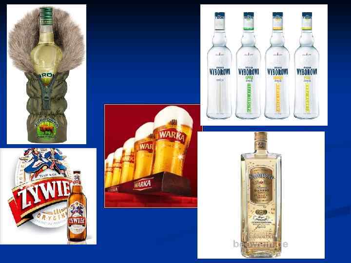 Напої Що стосується напоїв, тут слід підкреслити, що фірмовий польський алкогольний напій це чиста горілка широко відомих брендів, таких як: Chopin vodka, Belvedere, Luksusowa, Wyborowa. Пабло Пікассо якось сказав, що в першій половині 20 століття він три речі вважає найвидатнішими: блюз, кубізм і польську горілку. І любителів пива не розчарує те, що може запропонувати їм Польща. Тутешнє пиво нітрохи не гірше німецького або чеського. Серед численних сортів найвідоміші Żywiec, Warka і Elbląg. Також існує декілька особливих видів горілки: Żubrówka - горілка з травами, зібраними в національному парку Białowieża де живуть європейські бізони - зубри, які харчуються цією травою. Goldwasser горілка з Гданська, яка містить частинки 22 -каратного золота