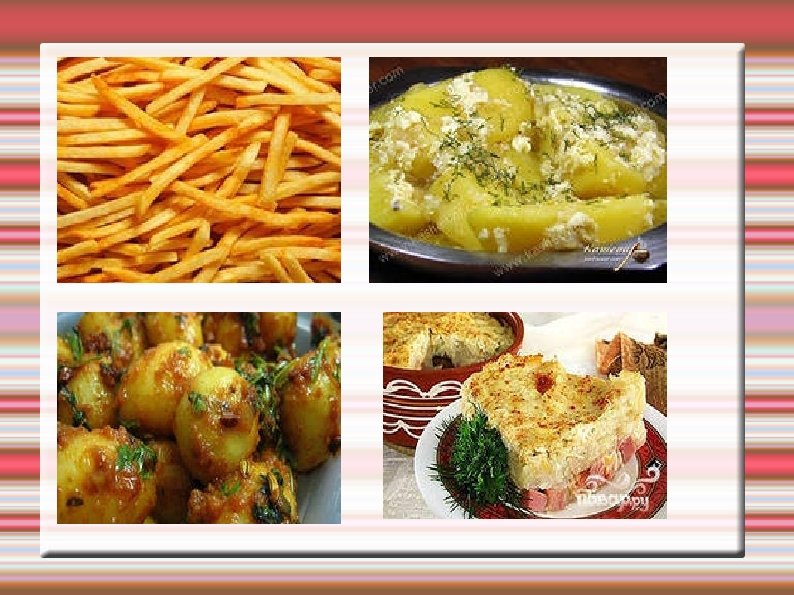 КАРТОФЕЛЬ В РОССИИ Начало разведения картофеля в России обычно связывают с именем Петра I. Существует версия, что Петр I, познакомившись с картофелем в Голландии и оценив его, послал графу Шереметеву мешок картофеля со строгим приказом разводить его в России. С этого мешка картофеля и началась история русской картошки. Сейчас, пожалуй, уже нет более всенародно любимого «русского» овоща, чем картофель. В современной русской кухне существуют многие тысячи самых разнообразных блюд, использующих картофель.