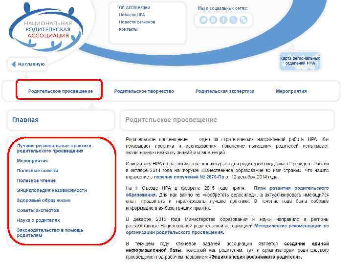 Родительское просвещение • • • Родительское просвещение - одно из стратегических направлений работы НРА. Как показывает практика и исследования, поколение нынешних родителей испытывает значительную нехватку знаний и компетенций. Инициативу НРА по развитию в регионах курсов для родителей поддержал Президент России в октябре 2014 года на Форуме «Качественное образование во имя страны» , что нашло отражение в перечне поручений № 2876 -Пр от 12 декабря 2014 года. На II Съезде НРА в феврале 2015 года принят План развития родительского образования. Для нас важно не «изобретать велосипед» , а актуализировать имеющийся опыт, продвигать и тиражировать лучшие практики. В течение года была собрана информационная база лучших практик. В декабре 2015 года Министерство образования и науки направило в регионы разработанные Национальной родительской ассоциацией Методические рекомендации по организации родительского просвещения. В текущем году ключевой задачей ассоциации является создание единой информационной базы, полезной как родителям, так и организаторам родительского просвещения под рабочим названием «Энциклопедия российского родителя» .
