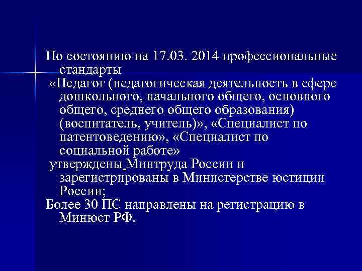 По состоянию на 17. 03. 2014 профессиональные стандарты «Педагог (педагогическая деятельность в сфере дошкольного, начального общего, основного общего, среднего общего образования) (воспитатель, учитель)» , «Специалист по патентоведению» , «Специалист по социальной работе» утверждены Минтруда России и зарегистрированы в Министерстве юстиции России; Более 30 ПС направлены на регистрацию в Минюст РФ.