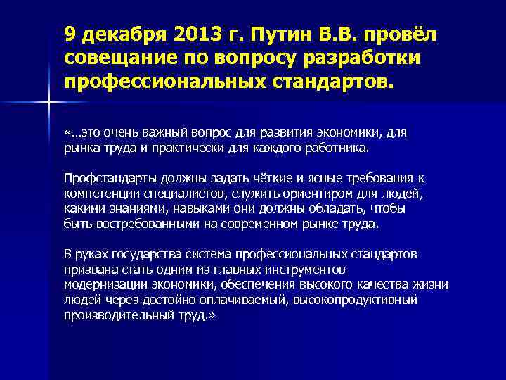 9 декабря 2013 г. Путин В. В. провёл совещание по вопросу разработки профессиональных стандартов. «…это очень важный вопрос для развития экономики, для рынка труда и практически для каждого работника. Профстандарты должны задать чёткие и ясные требования к компетенции специалистов, служить ориентиром для людей, какими знаниями, навыками они должны обладать, чтобы быть востребованными на современном рынке труда. В руках государства система профессиональных стандартов призвана стать одним из главных инструментов модернизации экономики, обеспечения высокого качества жизни людей через достойно оплачиваемый, высокопродуктивный производительный труд. »