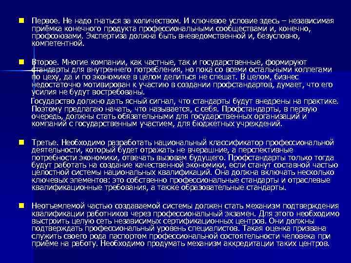 n Первое. Не надо гнаться за количеством. И ключевое условие здесь – независимая приёмка конечного продукта профессиональными сообществами и, конечно, профсоюзами. Экспертиза должна быть вневедомственной и, безусловно, компетентной. n Второе. Многие компании, как частные, так и государственные, формируют стандарты для внутреннего потребления, но пока со всеми остальными коллегами по цеху, да и по экономике в целом делиться не спешат. В целом, бизнес недостаточно мотивирован к участию в создании профстандартов, думает, что его усилия не будут востребованы. Государство должно дать ясный сигнал, что стандарты будут внедрены на практике. Поэтому предлагаю начать, что называется, с себя. Профстандарты, в первую очередь, должны стать обязательными для государственных организаций и компаний с государственным участием, для бюджетных учреждений. n Третье. Необходимо разработать национальный классификатор профессиональной деятельности, который будет отражать не вчерашние, а перспективные потребности экономики, отвечать вызовам будущего. Профстандарты только тогда будут работать на создание качественной экономики, если станут составной частью целостной системы национальных квалификаций. Она должна включать несколько ключевых элементов: это собственно профессиональные стандарты и отраслевые квалификационные требования, а также образовательные стандарты. n Неотъемлемой частью создаваемой системы должен стать механизм подтверждения квалификации работников через профессиональный экзамен. Для этого необходимо выстроить целую сеть независимых сертификационных центров. Они должны подтверждать профессиональный уровень специалистов. Такая оценка призвана служить своего рода паспортом профессиональной состоятельности человека приёме на работу. Необходимо продумать механизм аккредитации таких центров.