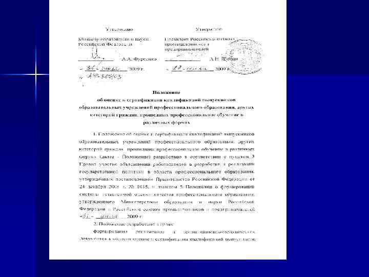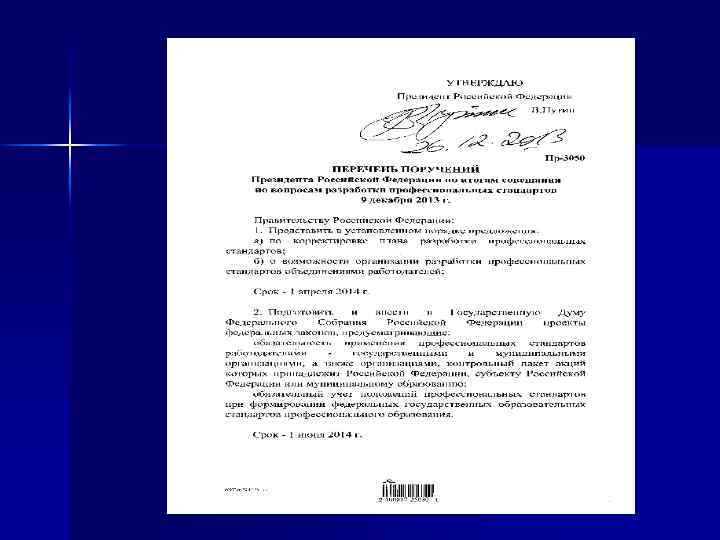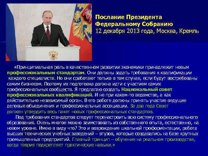 Послание Президента Федеральному Собранию 12 декабря 2013 года, Москва, Кремль «Принципиальная роль в качественном развитии экономики принадлежит новым профессиональным стандартам. Они должны задать требования к квалификации каждого специалиста. Но они сработают только в том случае, если будут востребованы самим бизнесом. Поэтому их подготовка должна идти с участием самих профессиональных сообществ. Я предлагаю создать Национальный совет профессиональных квалификаций. И не при каком-то ведомстве, а как действительно независимый орган. В его работе должны принять участие ведущие деловые объединения и профессиональные ассоциации. За два года Совет должен утвердить весь пакет новых профессиональных стандартов. Под требования стандартов следует перенастроить всю систему профессионального образования. Очень многое можно заимствовать из собственного опыта, естественно, на новом уровне. Имею в виду что? Это и возрождение школьной профориентации, работа высших технических учебных заведений – втузов, которые создавались на базе крупных промышленных предприятий. Главный принцип – обучение на реальном производстве, когда теория подкрепляет практические навыки. »