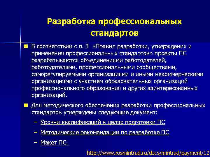 Разработка профессиональных стандартов n В соответствии с п. 3 «Правил разработки, утверждения и применения профессиональных стандартов» проекты ПС разрабатываются объединениями работодателей, работодателями, профессиональными сообществами, саморегулируемыми организациями и иными некоммерческими организациями с участием образовательных организаций профессионального образования и других заинтересованных организаций. n Для методического обеспечения разработки профессиональных стандартов утверждены следующие документ: – Уровни квалификаций в целях подготовки ПС – Методические рекомендации по разработке ПС – Макет ПС. http: //www. rosmintrud. ru/docs/mintrud/payment/12