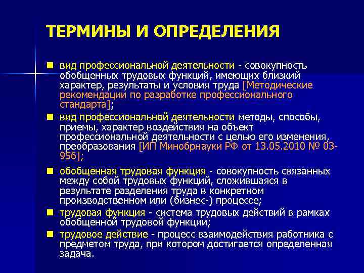 ТЕРМИНЫ И ОПРЕДЕЛЕНИЯ n вид профессиональной деятельности - совокупность обобщенных трудовых функций, имеющих близкий характер, результаты и условия труда [Методические рекомендации по разработке профессионального стандарта]; n вид профессиональной деятельности методы, способы, приемы, характер воздействия на объект профессиональной деятельности с целью его изменения, преобразования [ИП Минобрнауки РФ от 13. 05. 2010 № 03 ИП Минобрнауки РФ от 956]; n обобщенная трудовая функция - совокупность связанных между собой трудовых функций, сложившаяся в результате разделения труда в конкретном производственном или (бизнес-) процессе; n трудовая функция - система трудовых действий в рамках обобщенной трудовой функции; n трудовое действие - процесс взаимодействия работника с предметом труда, при котором достигается определенная задача.