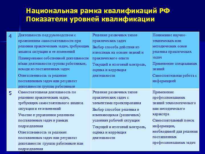 Национальная рамка квалификаций РФ Показатели уровней квалификации 4 Деятельность под руководством с проявлением самостоятельности при решении практических задач, требующих анализа ситуации и ее изменений Решение различных типов практических задач Выбор способа действия из известных на основе знаний и Планирование собственной деятельности практического опыта и/или деятельности группы работников, Текущий и итоговый контроль, исходя из поставленных задач оценка и коррекция 5 Ответственность за решение поставленных задач или результат деятельности группы работников Самостоятельная деятельность по решению практических задач, требующих самостоятельного анализа ситуации и ее изменений Участие в управлении решением поставленных задач в рамках подразделения Ответственность за решение поставленных задач или результат деятельности группы работников или подразделения Понимание научнотехнических или методических основ решения практических задач Применение специальных знаний деятельности Самостоятельная работа с информацией Решение различных типов практических задач с элементами проектирования Применение профессиональных знаний технологического или методического характера Выбор способов решения в изменяющихся (различных) условиях рабочей ситуации Текущий и итоговый контроль, оценка и коррекция деятельности Самостоятельный поиск информации, необходимой для решения поставленных профессиональных задач