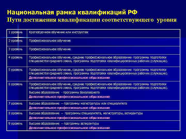 Национальная рамка квалификаций РФ Пути достижения квалификации соответствующего уровня 1 уровень Краткосрочное обучение или инструктаж 2 уровень Профессиональное обучение 3 уровень Профессиональное обучение 4 уровень Профессиональное обучение, среднее профессиональное образование- программы подготовки специалистов среднего звена, программы подготовки квалифицированных рабочих (служащих). 5 уровень Профессиональное обучение, среднее профессиональное образование- программы подготовки специалистов среднего звена, программы подготовки квалифицированных рабочих (служащих). Дополнительное профессиональное образование 6 уровень Профессиональное обучение, среднее профессиональное образование- программы подготовки специалистов среднего звена, программы подготовки квалифицированных рабочих (служащих). Высшее образование - программы бакалавриата Дополнительное профессиональное образование 7 уровень Высшее образование – программы магистратуры или специалитета Дополнительное профессиональное образование 8 уровень Высшее образование – программы специалитета, магистратуры, аспирантуры Дополнительное профессиональное образование 9 уровень Высшее образование – программы аспирантуры Дополнительное профессиональное образование