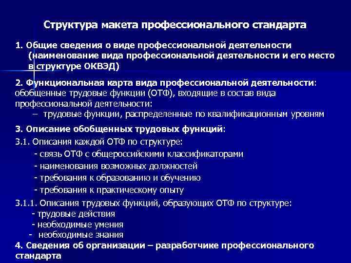 Структура макета профессионального стандарта 1. Общие сведения о виде профессиональной деятельности (наименование вида профессиональной деятельности и его место в структуре ОКВЭД) 2. Функциональная карта вида профессиональной деятельности : обобщенные трудовые функции (ОТФ), входящие в состав вида профессиональной деятельности: – трудовые функции, распределенные по квалификационным уровням 3. Описание обобщенных трудовых функций: 3. 1. Описания каждой ОТФ по структуре: - связь ОТФ с общероссийскими классификаторами - наименования возможных должностей - требования к образованию и обучению - требования к практическому опыту 3. 1. 1. Описания трудовых функций, образующих ОТФ по структуре: - трудовые действия - необходимые умения - необходимые знания 4. Сведения об организации – разработчике профессионального стандарта