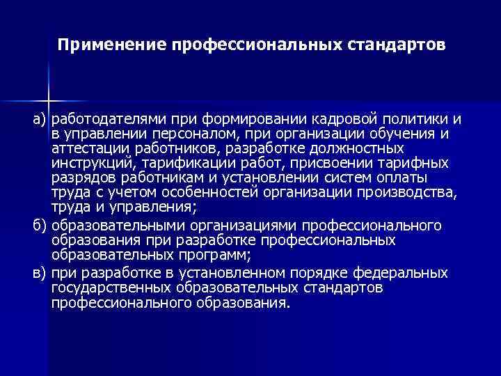 Применение профессиональных стандартов а) работодателями при формировании кадровой политики и в управлении персоналом, при организации обучения и аттестации работников, разработке должностных инструкций, тарификации работ, присвоении тарифных разрядов работникам и установлении систем оплаты труда с учетом особенностей организации производства, труда и управления; б) образовательными организациями профессионального образования при разработке профессиональных образовательных программ; в) при разработке в установленном порядке федеральных государственных образовательных стандартов профессионального образования.