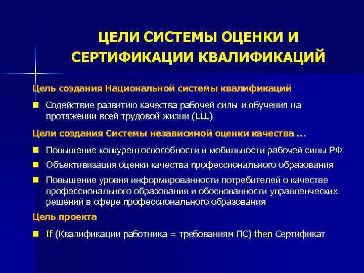 ЦЕЛИ СИСТЕМЫ ОЦЕНКИ И СЕРТИФИКАЦИИ КВАЛИФИКАЦИЙ Цель создания Национальной системы квалификаций n Содействие развитию качества рабочей силы и обучения на протяжении всей трудовой жизни (LLL) Цели создания Системы независимой оценки качества … n Повышение конкурентоспособности и мобильности рабочей силы РФ n Объективизация оценки качества профессионального образования n Повышение уровня информированности потребителей о качестве профессионального образования и обоснованности управленческих решений в сфере профессионального образования Цель проекта n If (Квалификации работника = требованиям ПС) then Сертификат