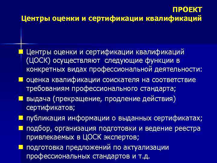 ПРОЕКТ Центры оценки и сертификации квалификаций n Центры оценки и сертификации квалификаций (ЦОСК) осуществляют следующие функции в конкретных видах профессиональной деятельности: n оценка квалификации соискателя на соответствие требованиям профессионального стандарта; n выдача (прекращение, продление действия) сертификатов; n публикация информации о выданных сертификатах; n подбор, организация подготовки и ведение реестра привлекаемых в ЦОСК экспертов; n подготовка предложений по актуализации профессиональных стандартов и т. д.