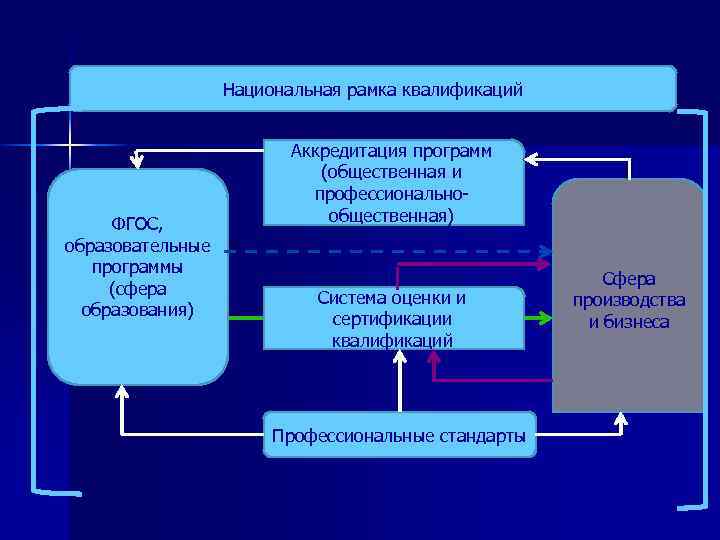 Национальная рамка квалификаций ФГОС, образовательные программы (сфера образования) Аккредитация программ (общественная и профессиональнообщественная) Система оценки и сертификации квалификаций Профессиональные стандарты Сфера производства и бизнеса