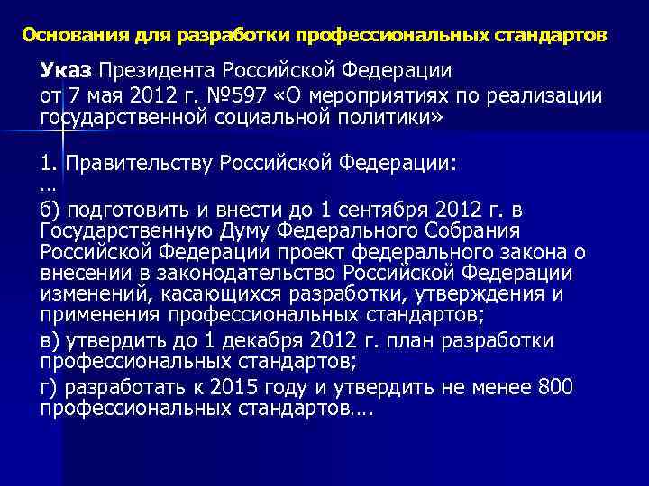 Основания для разработки профессиональных стандартов Указ Президента Российской Федерации от 7 мая 2012 г. № 597 «О мероприятиях по реализации государственной социальной политики» 1. Правительству Российской Федерации: … б) подготовить и внести до 1 сентября 2012 г. в Государственную Думу Федерального Собрания Российской Федерации проект федерального закона о внесении в законодательство Российской Федерации изменений, касающихся разработки, утверждения и применения профессиональных стандартов; в) утвердить до 1 декабря 2012 г. план разработки профессиональных стандартов; г) разработать к 2015 году и утвердить не менее 800 профессиональных стандартов….
