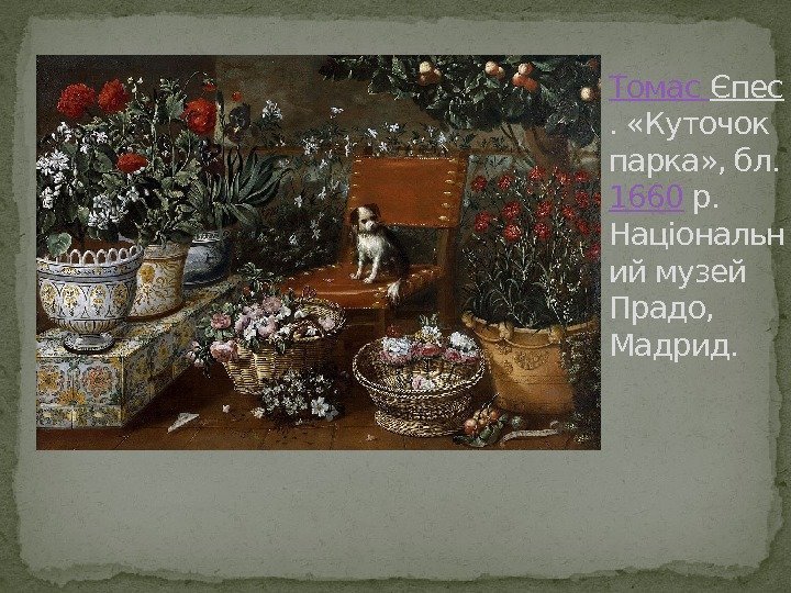 Томас Єпес. «Куточок парка» , бл. 1660 р. Національн ий музей Прадо, Мадрид.