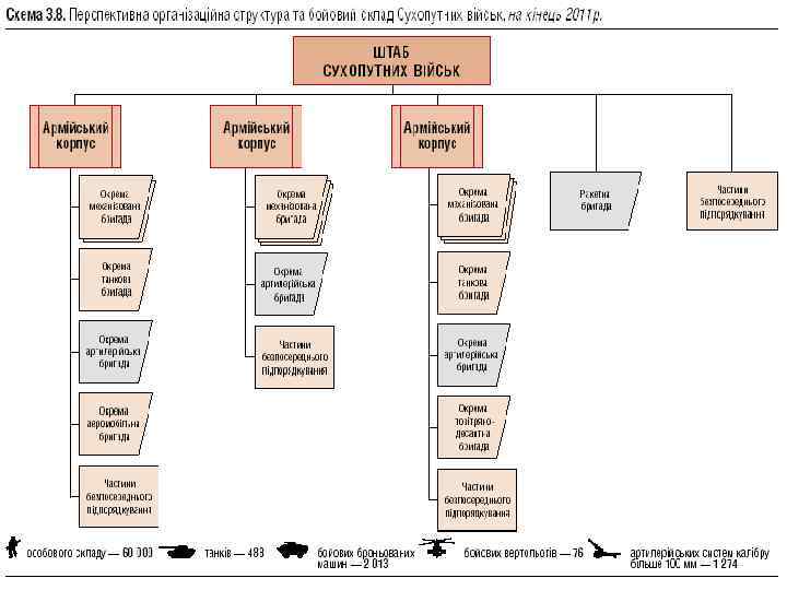 Військовий інститут Київського національного університету імені Тараса Шевченка Роди військ СВ: 1. Механізовані та танкові війська 2. Ракетні війська та артилерія (РВіА) 3. Аеромобільні війська (Аем. В) 4. Війська протиповітряної оборони (ППО) 5. Авіація Сухопутних військ (Ав СВ) Спеціальні війська: підрозділи зв'язку, розвідки і радіоелектронної боротьби (РЕБ) , інженерні, РХБ захисту, військові частини, установи та організації логістики (матеріально-технічного забезпечення). Механізовані, танкові, аеромобільні бригади будуть основними елементами СВ, матимуть можливість брати участь у об'єднаних і багатонаціональних операціях, а також володіти високою самостійністю і здатними виконувати різноманітні завдання у різних умовах обстановки.