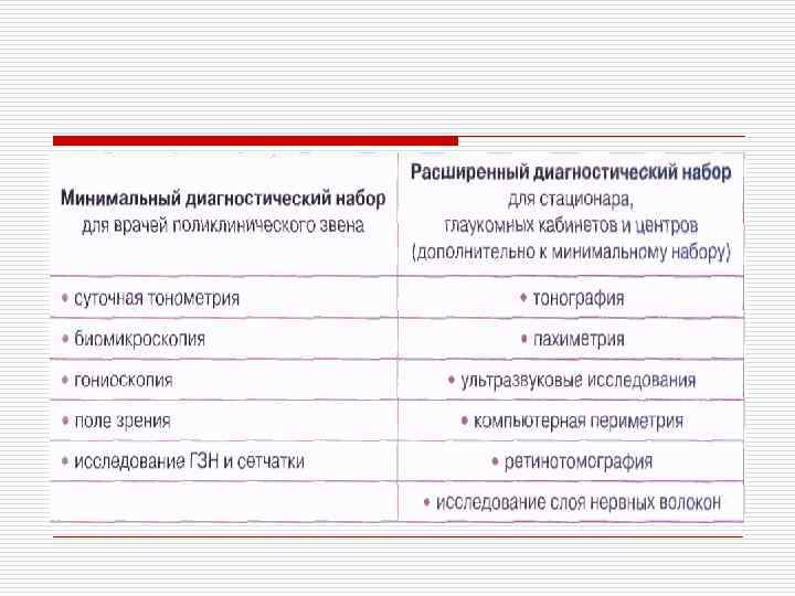 Необходимый минимум обследования при Оф. Г o o o Тонометрия Тонография Суточная тонометрия Нагрузочные пробы Компьютерная периметрия Исследование толщины роговицы