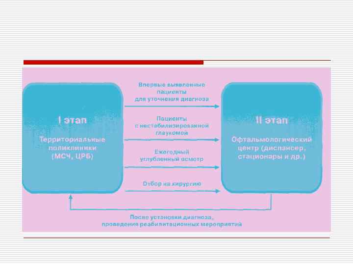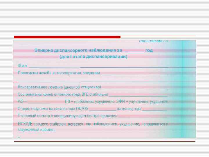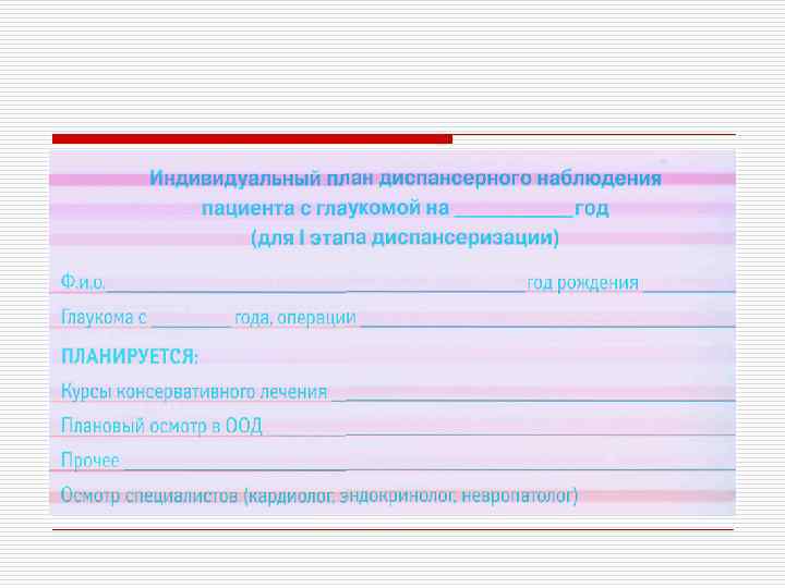 По течению болезни o Стабилизированная – при длительном наблюдении (не менее 6 мес. ) не обнаруживают ухудшения в состоянии поля зрения и ДЗН. o Нестабилизированная – ухудшение состояния поля зрения и ДЗН при повторных исследованиях. Учитывают также состояние ВГД и его соответствие «давлению цели»